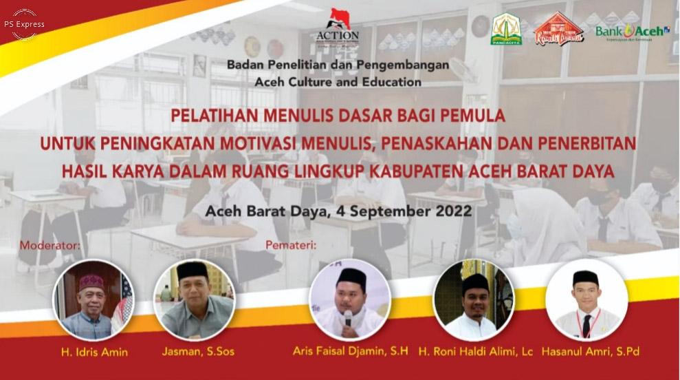 NusaOne.com|Aceh Barat Daya – Badan Penelitian dan Pengembangan Aceh Culture and Education mengadakan Pelatihan Menulis di Kabupaten Aceh Barat Daya, pelatihan ini mengusung judul “Pelatihan Menulis Dasar Bagi Pemula Untuk Peningkatan Motivasi Menulis, Penaskahan dan Penerbitan Hasil Karya Dalam Ruang Lingkup Kabupaten Aceh Barat Daya” yang akan dilaksanakan pada (Minggu 4/22).