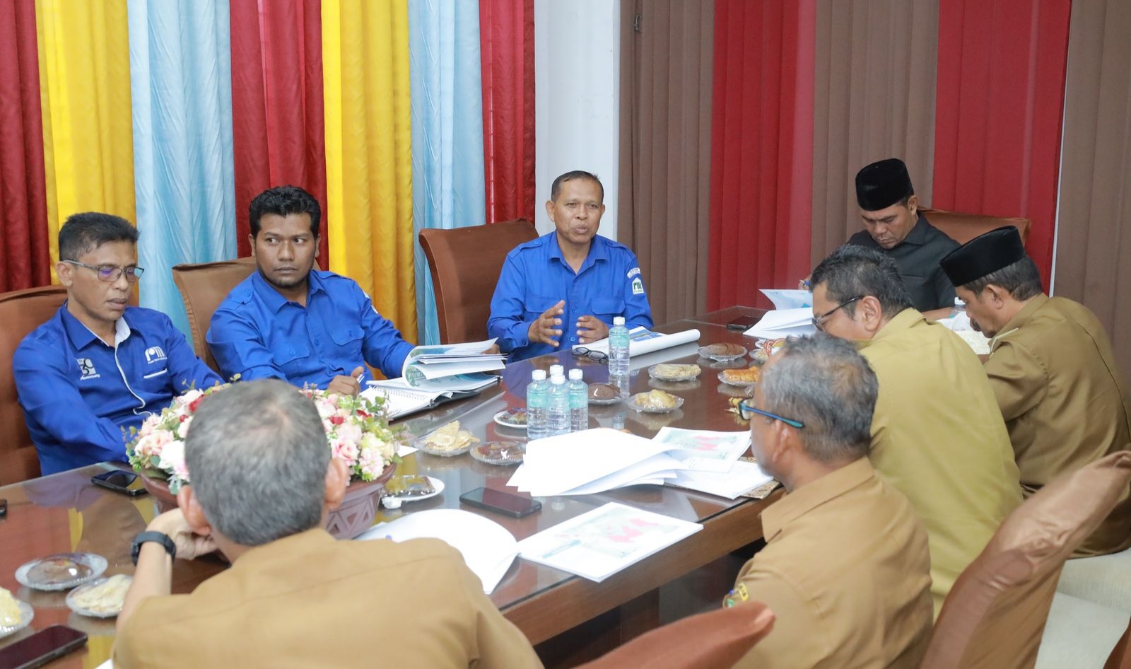 NusaOne.Com | Aceh Besar – Bupati Aceh Besar Muharram Idris (Syech Muharram) didampingi Wakil Bupati Drs. Syukri A Jalil memanggil Direktur utama berserta direksi PDAM Tirta Mountala untuk melakukan pemaparan hasil pelaksanaan kerja PDAM Tirta Mountala sebagai Badan Usaha Milik Daerah (BUMD) periode 2018 hingga 2024 di Ruang Rapat Gedung Dekranasda Gampong Gani, Kecamatan Ingin Jaya, Aceh Besar, Selasa (22/04/2025).
