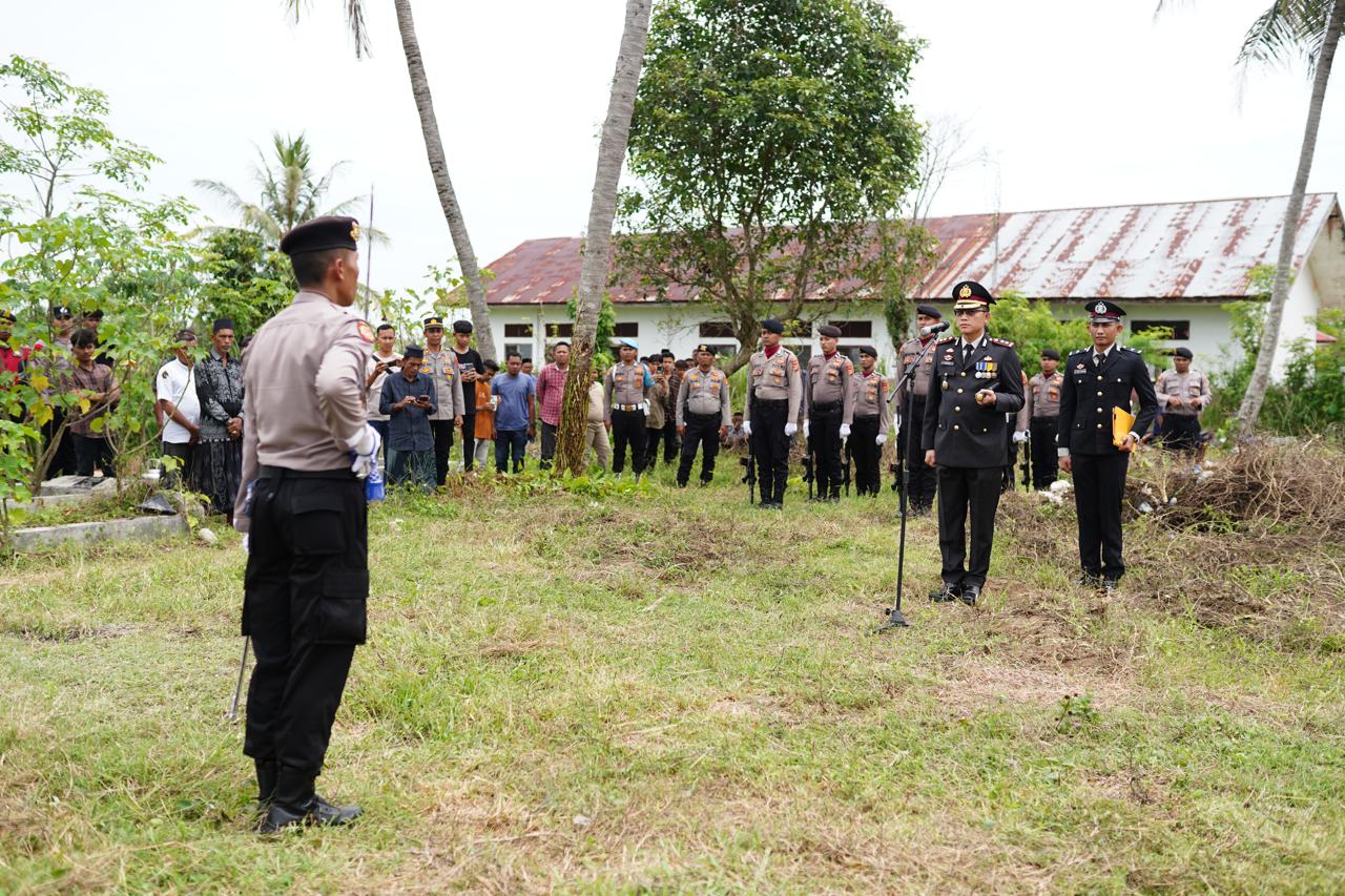 NusaOne.com | Sigli – Kapolres Pidie AKBP Jaka Mulyana, SIK, MIK memimpin langsung upacara pemakaman Aipda Hendri Saputra personel Polres Pidie yang terakhir bertugas sebagai personel Polsek Sakti