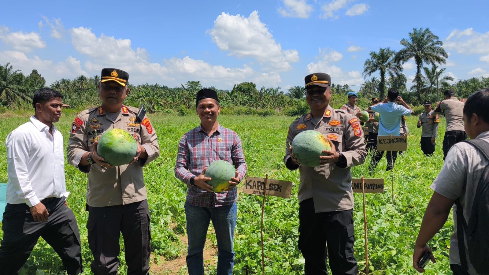 NusaOne.com | Subulussalam – Kapolres Subulussalam AKBP Muhammad Yusuf, menghadiri dan mengikuti panen semangka program ketahanan pangan di Dusun Makmur Barat, Kampong Suka Makmur, Kecamatan Simpang Kiri Kota Subulussalam, Senin, 2 Juni 2025.