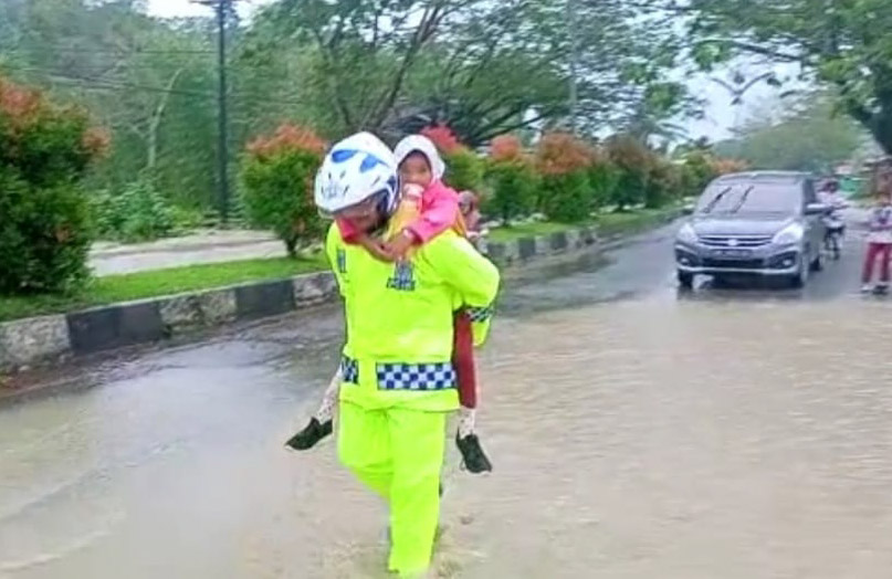 “Anak itu mau menyeberang, tapi di lokasi jalan itu tergenang air. Daripada sepatunya basah, saya gendong saja sampai ke seberang jalan,” ujarnya.