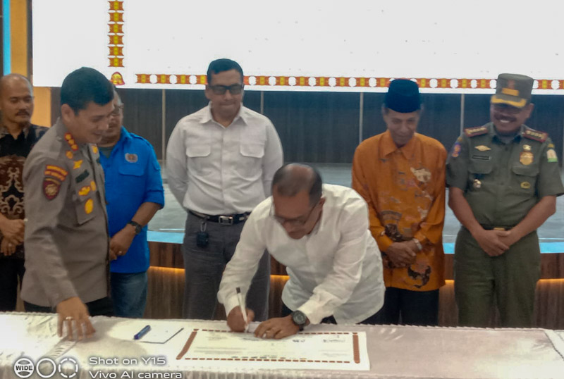 NusaOne.com |Banda Aceh – Sejumlah lembaga dalam pemerintah Aceh menandatangani komitmen bersama tentang penerapan kearifan lokal yang efektif di gedung presisi Polda Aceh, Jumat (18/11).