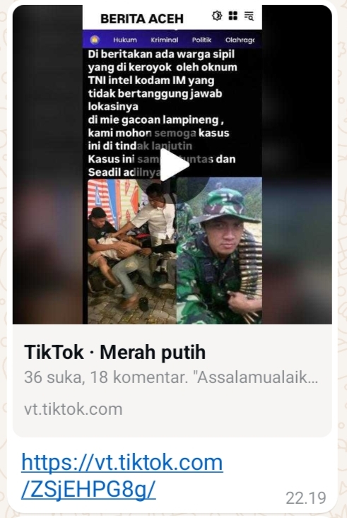 Sementara di brand video juga tertulis, ” Diberitakan ada warga sipil yang dikeroyok oleh oknum TNI Intel Kodam IM yng tidak bertanggung jawab, lokasinya di mie Gacoan lampineng, kami mohon semoga kasus ini di tindaklanjuti kasus ini sampai tuntas dan seadil adilnya “.