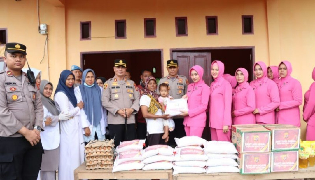 NusaOne.com | Lhoksukon – Kapolres Aceh Utara AKBP Deden Heksaputera S, S.I.K. bersama Ketua Bhayangkari cabang aceh utara serahkan bantuan sosial masa panik kepada masyarakat terdampak banjir di desa bukit linteng dan desa lubuk pusaka kecamatan langkahan. Selasa (24/1/2023).