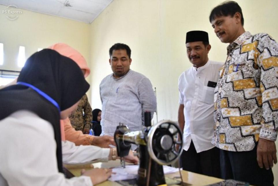 Pj Bupati Aceh Besar, Staf Ahli Bupati dan Kepala Disnakertrans Aceh Besar meninjau peserta pelatihan menjahit di Kantor Disnakertrans Aceh Besar, Jantho, Jum’at (9/9/2022).