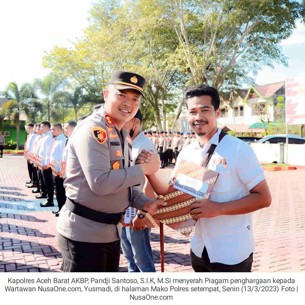 Kepala Kepolisian Resor (Kapolres) Aceh Barat, AKBP, Pandji Santoso, S.I.K, M.Si, memberikan Piagam penghargaan kepada Wartawan NusaOne.com, Yusmadi, yang berlangsung di halaman Mapolres setempat, Senin, (13/3/2023).