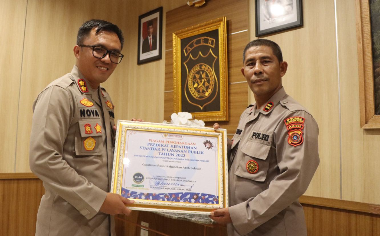 NusaOne.com | Aceh Selatan – Kerja keras jajaran disertai rasa ikhlas Kepolisian Resor Aceh Selatan dalam memberikan pelayanan prima kepada masyarakat berhasil meraih penghargaan dari Ombudsman RI.