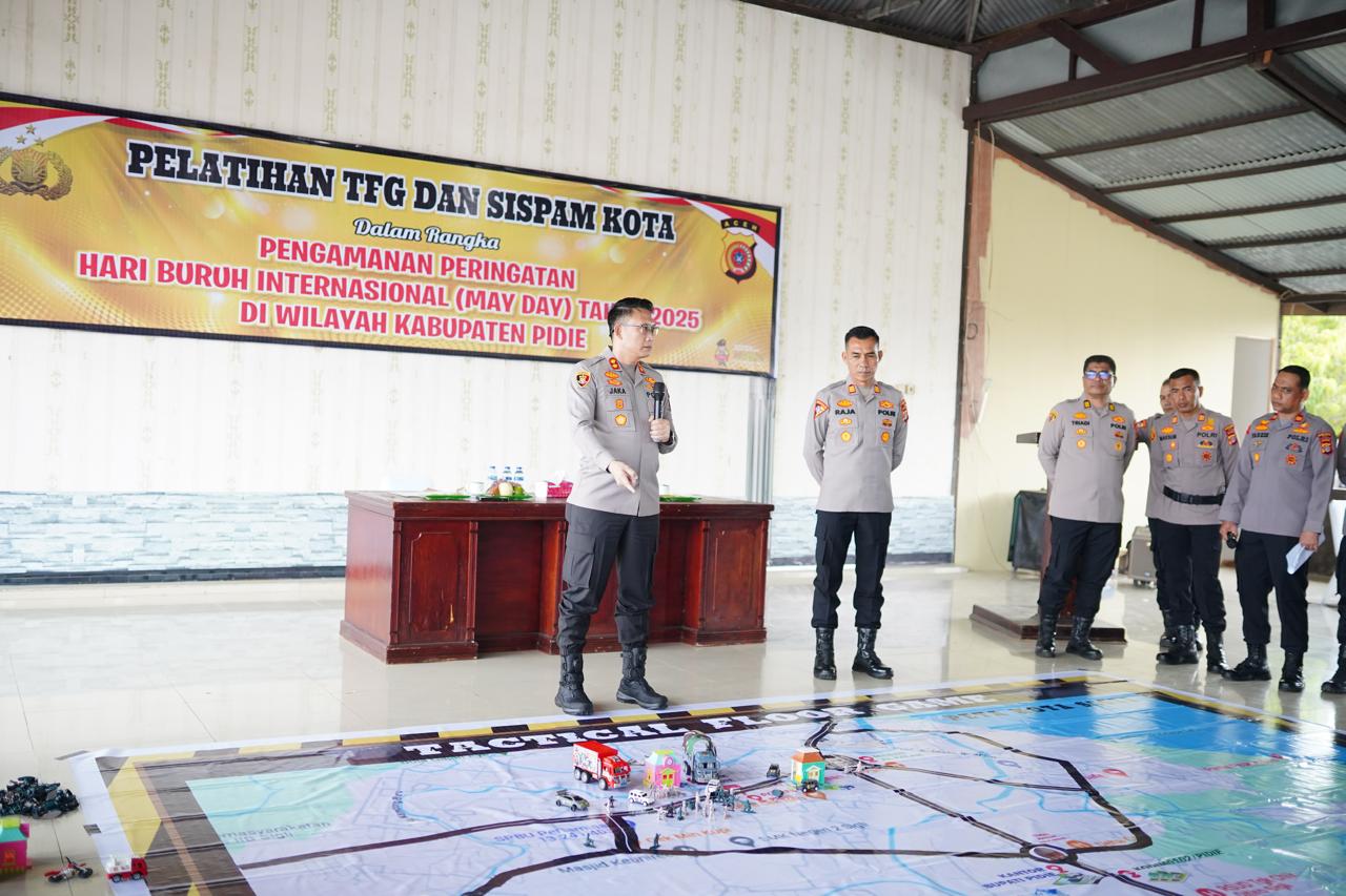 Kapolres Pidie AKBP Jaka Mulyana, SIK, MIK menjelaskan beberapa hal teknis terkait pengamanan yang akan dilakukan. TFG merupakan salah satu bentuk untuk mengaplikasikan bagian dari tugas personil di lapangan saat bertugas.