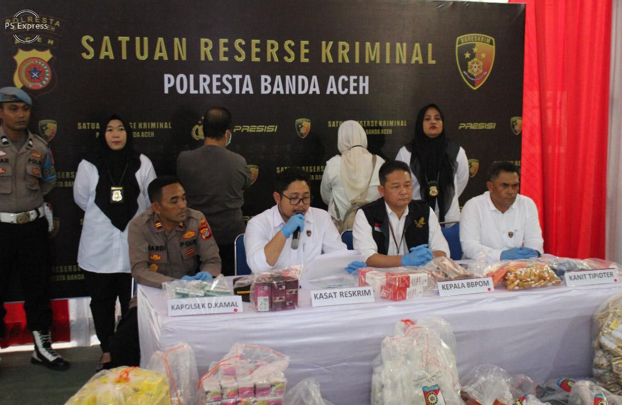 Hal ini diungkapkan Kasat Reskrim Polresta Banda Aceh, Kompol Fadhillah Aditya Pratama, SIK didampingi Kepala BPOM Aceh, Yudi Noviandi, M.Sc, Tech, Apt, Kapolsek Darul Kamal, Iptu Hardi, SH dan Kanit Tipidter, Ipda Al Ansar saat konferensi pers di Mapolresta Banda Aceh, Senin (14/11/2022).