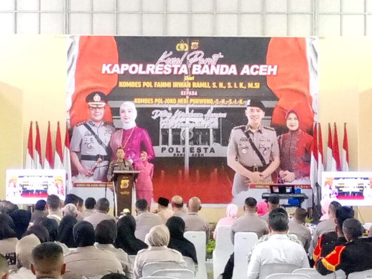 NusaOne.com | Banda Aceh – Kepolisian Resor Kota Banda Aceh menggelar upacara serah terima jabatan Kapolresta yang berlangsung khidmat di Aula Meuligoe Rastra Sewakottama, Kamis pagi (10/4/2025). Dalam prosesi tersebut, Kombes Pol Fahmi Irawan Ramli, S.H., S.I.K., M.Si secara resmi menyerahkan tongkat komando kepada penggantinya, Kombes Pol Joko Heri Purwono, S.H., S.I.K.
