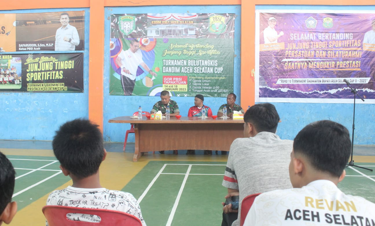 Pembukaan turnamen ini dilakukan oleh Ketua harian I PBSI Kabupaten Aceh Selatan Oni Arif dan turut dihadiri Dandim 0107/Aceh Selatan yang diwakili Pasi Intel Kodim Letda Inf Wardiadis, Pasiop Kodim Kapten Arh Rahman sekaligus Ketua Panita Kejuaraan Bulu Tangkis Dandim Cup I Tahun 2023, para Danramil/Batuud jajaran Kodim 0107/Aceh Selatan serta peserta turnamen.
